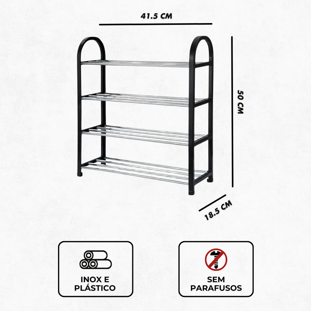 - Prateleira com 4 andares, oferecendo amplo espaço para armazenar até 8 pares de sapatos ou outros itens.